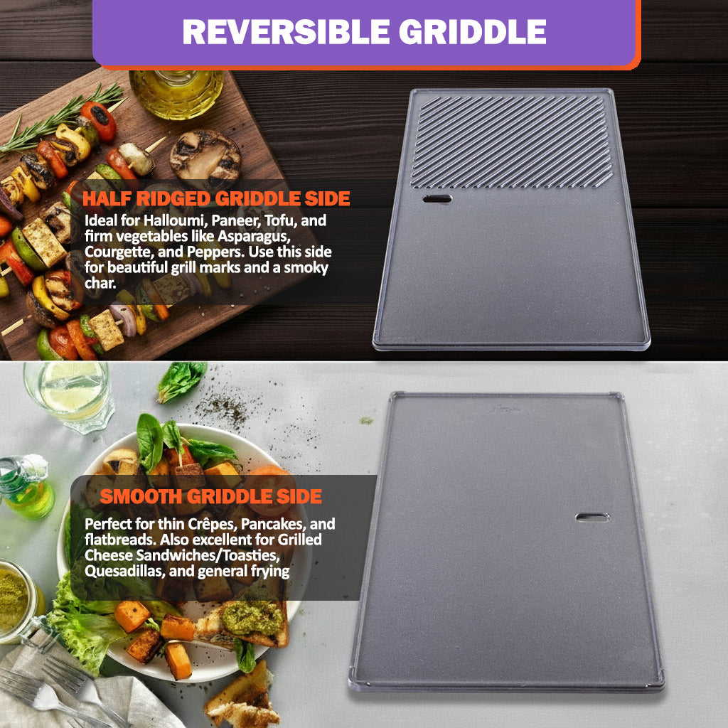 - ✅ Zweiseitiges Design: Eine komplett glatte Seite und eine Hybridseite (halb glatt, halb geriffelt) für vielseitiges Kochen; mit integriertem Ölablauf.