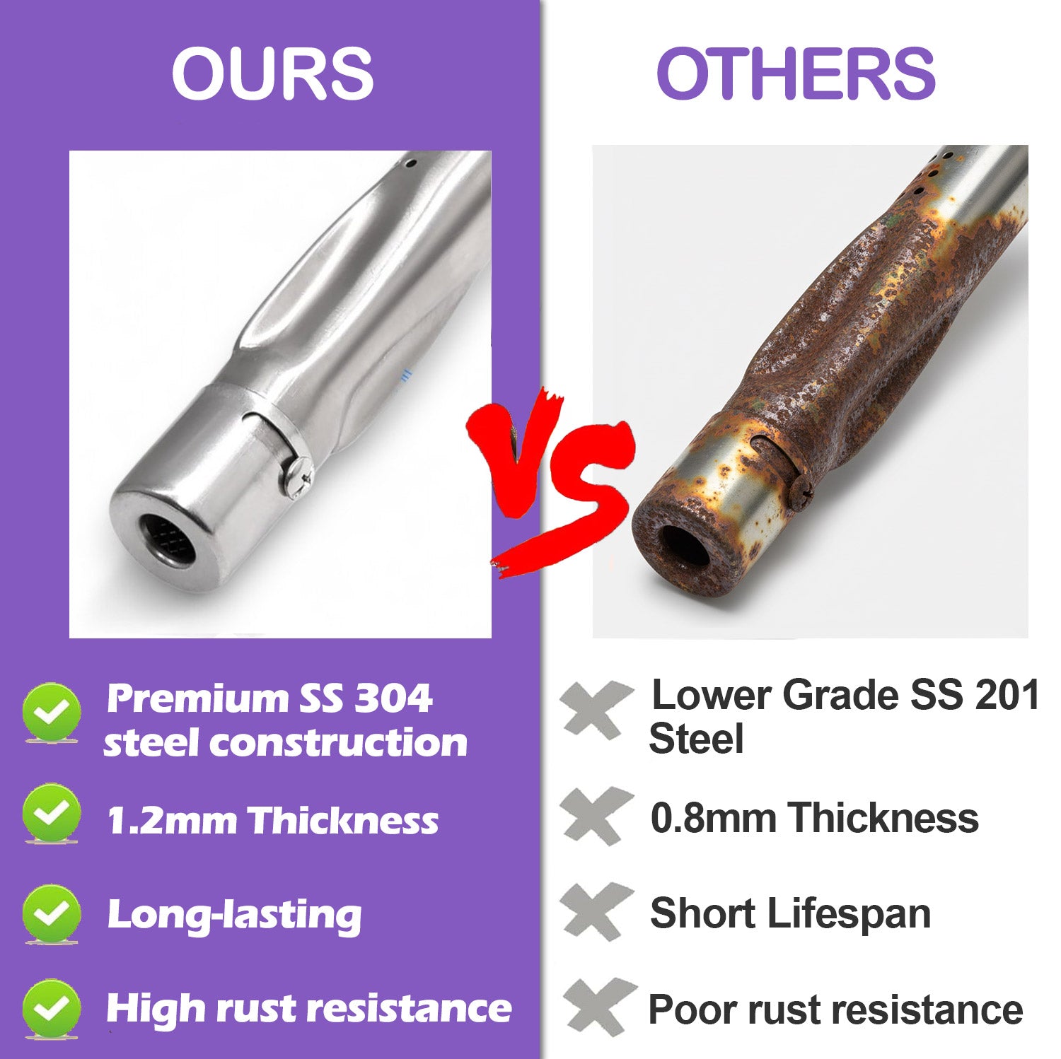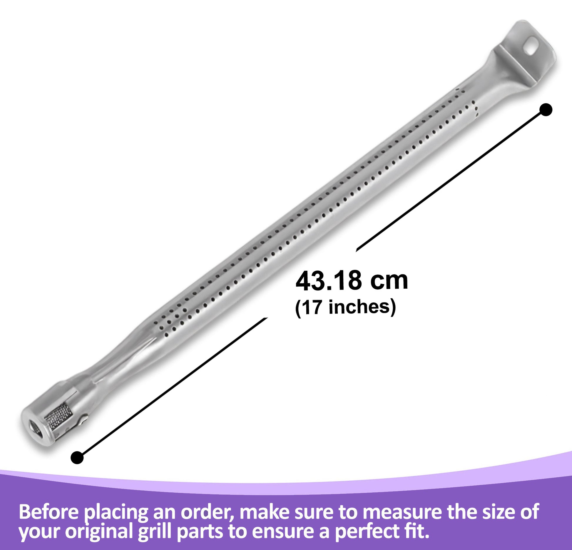 Jeder Ersatz Grill Brenner misst ca. 43,1 cm in der Länge und besteht aus robustem 1,2 mm starkem Edelstahl SS 304. Dieses hochwertige Material bietet eine ausgezeichnete Korrosionsbeständigkeit und eine stabile Wandstärke, sodass Ihr Grill auch bei häufiger und intensiver Nutzung optimale Temperaturen erreicht und hält.
