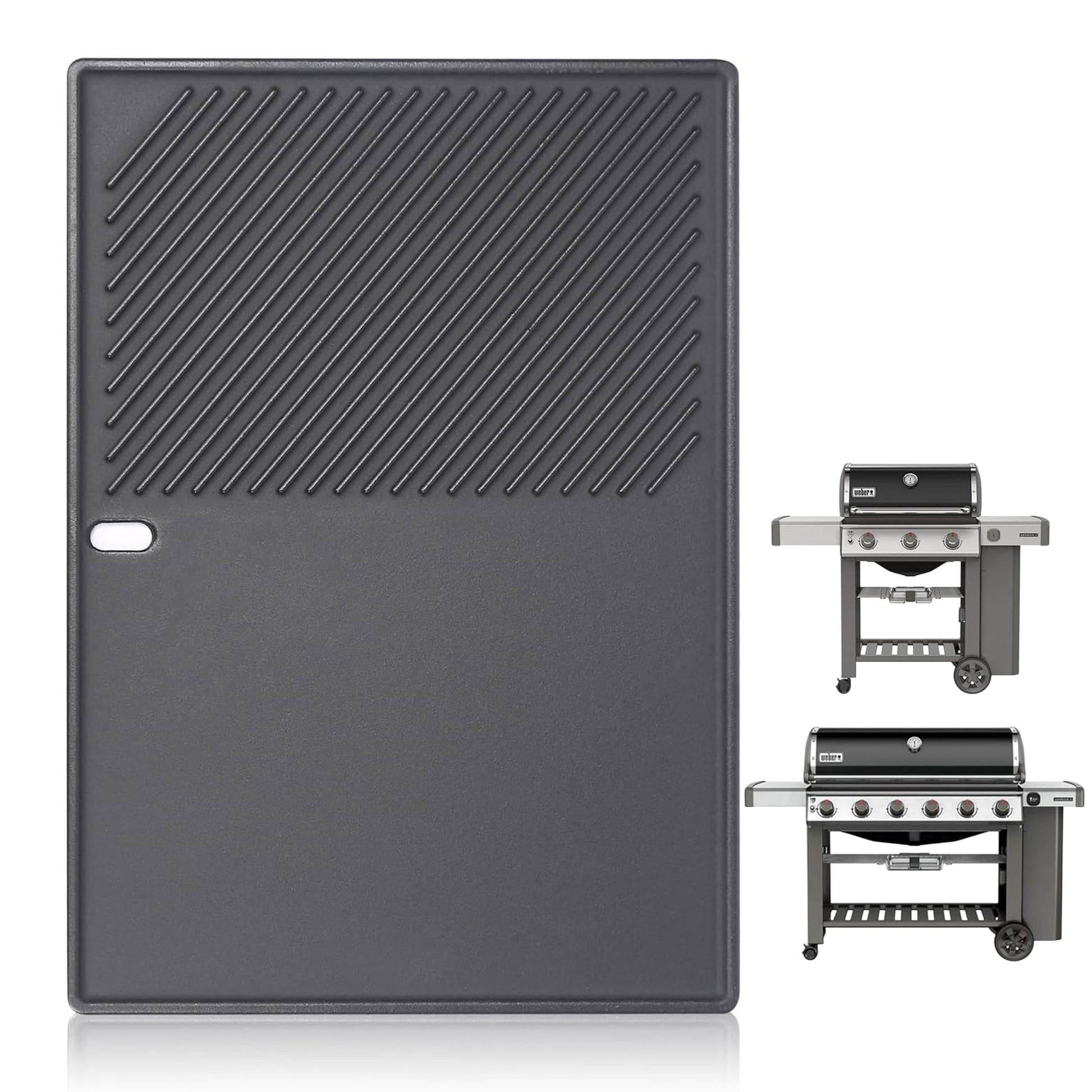 Expand your grilling options with this heavy-duty enameled cast iron flat griddle – exact replacement for Weber OEM part 7599. Designed for popular Genesis II 300 and 600 models like E-310, E-315, E-325, E-330, E-610, S-335, S-345, and more. The matte porcelain enamel provides excellent heat retention, rust resistance, and easy cleanup—no seasoning needed. Features a smart oil drain hole for healthier cooking and a built-in handle for safe handling.